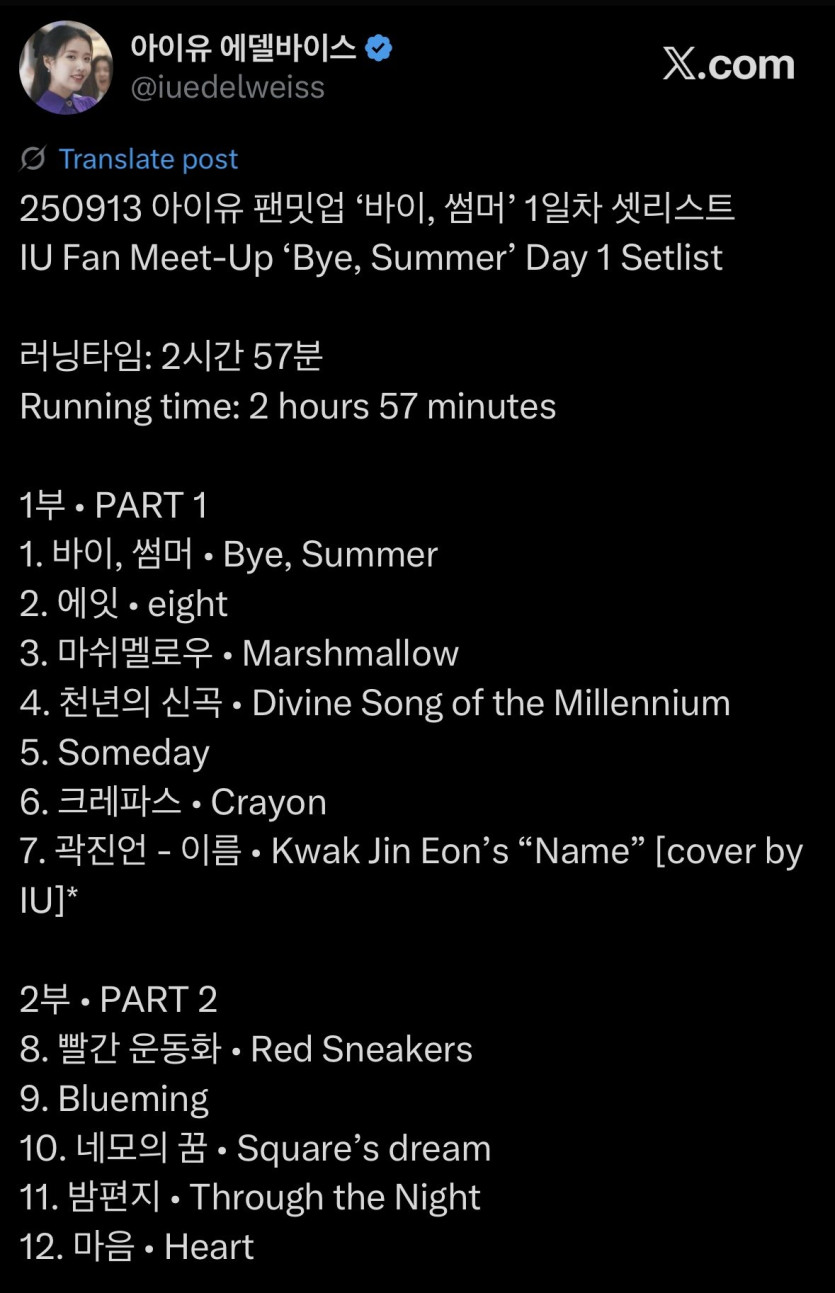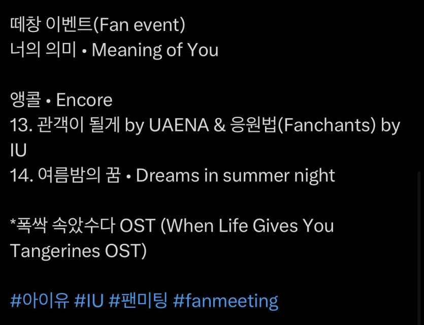 아이유 '팬미팅' 셋리스트 개수작 0 117 0 0 09.16 17:44 주소복사 복사되었습니다! 셋리스트 14곡러닝타임 3시간티켓가격 5.5 ~ 8.8만원콘서트 아니고 팬미팅mc 문상훈+팬미팅 입장 선물 냉방석손풍기타투스티커아크릴스탠드키캡키링포카 0 0