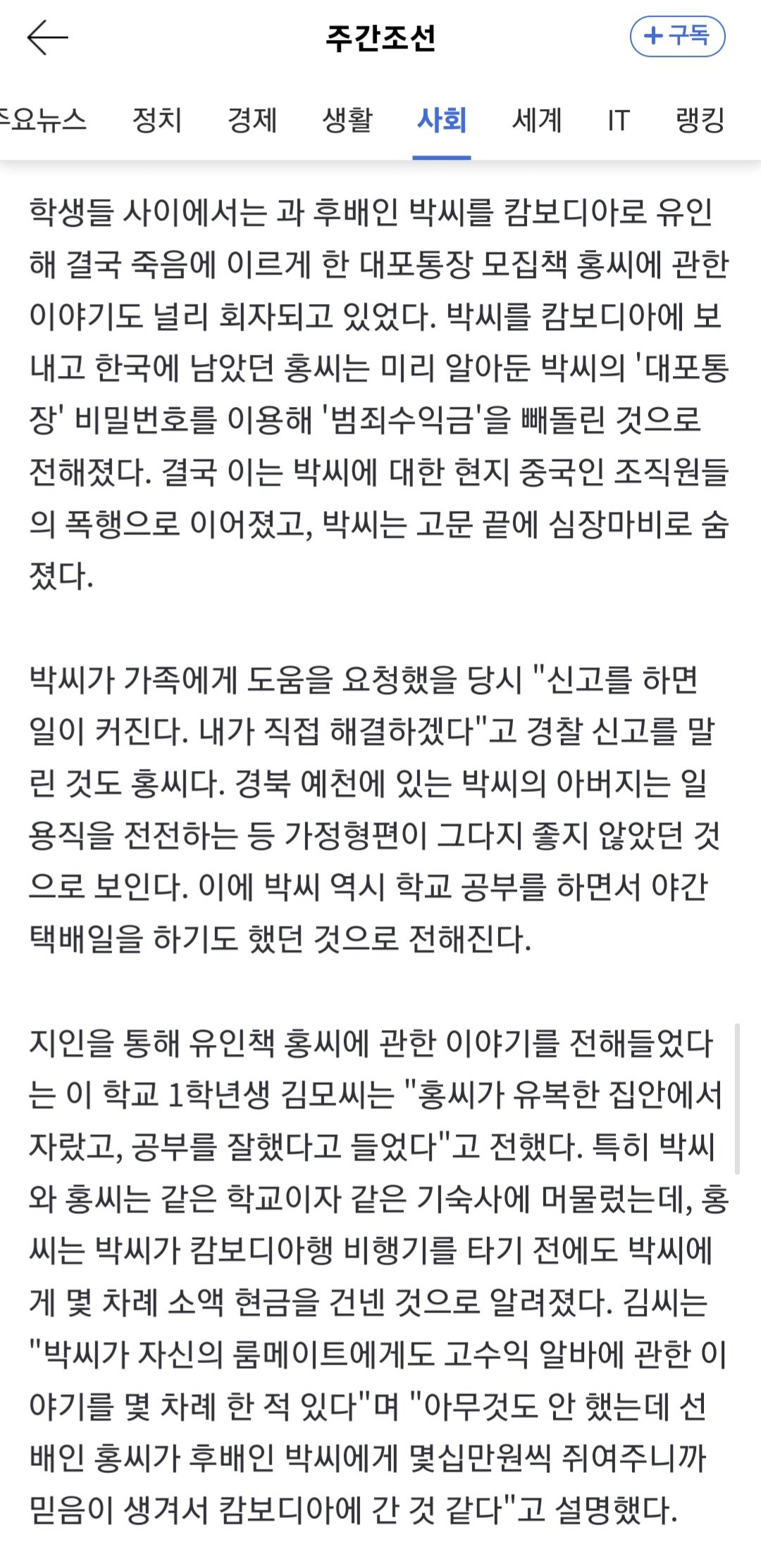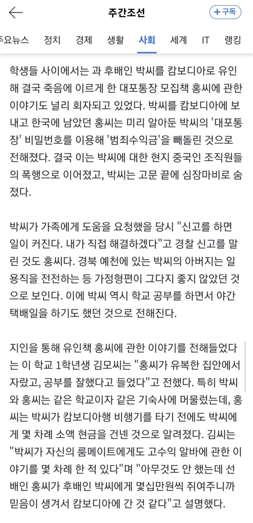 대포통장 모집책/조직원인 같은 대학교 선배가 이러한 상황을 노렸는지 용돈을 통해 피해자의 환심을 산 후 캄보디아 고수익 알바를 제안 (피해자 외에도 본인의 기숙사 룸메이트에게도 제안했다고 함)