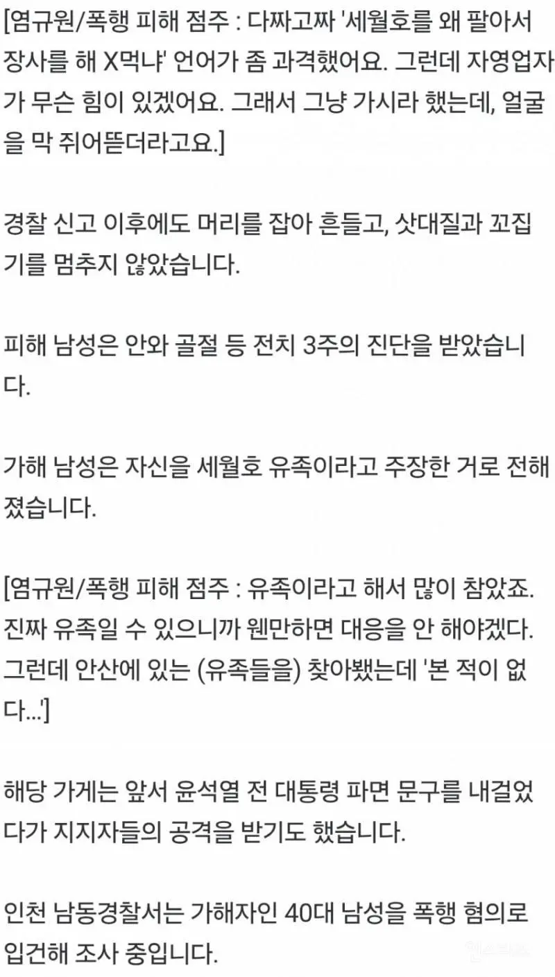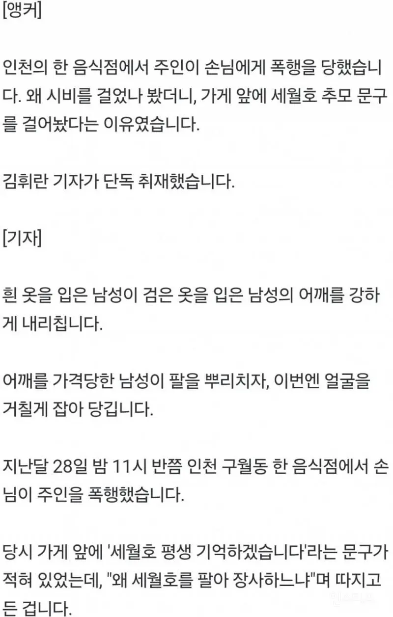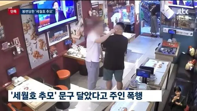 '세월호 추모' 음식점 주인, 손님이 폭행 고맙네놀랍군 0 1013 0 0 08.08 23:22 주소복사 복사되었습니다! 그렇게 당당하면 그냥 그게 꼴배기 싫었다고 말하지 짜치게 유족이라고 구라치는건 뭐임? 진짜 등신~ 0 0