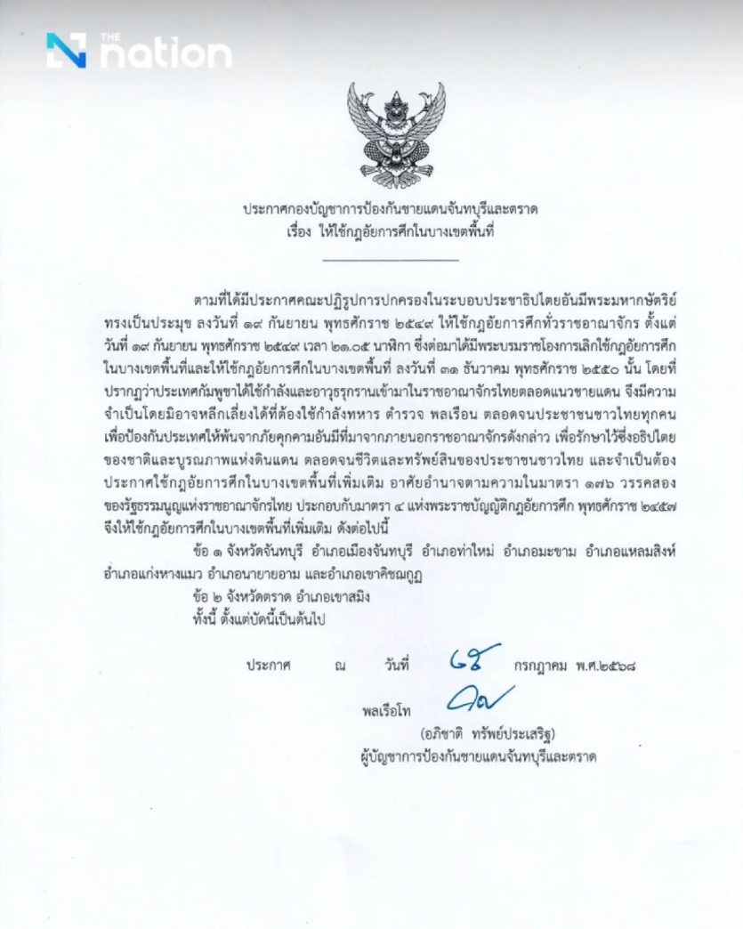 찬타부리-뜨랏 국경 방위 사령부는 금요일에 두 지방의 8개 구역에 계엄령을 선포했으며, 이는 즉시 발효되었습니다.