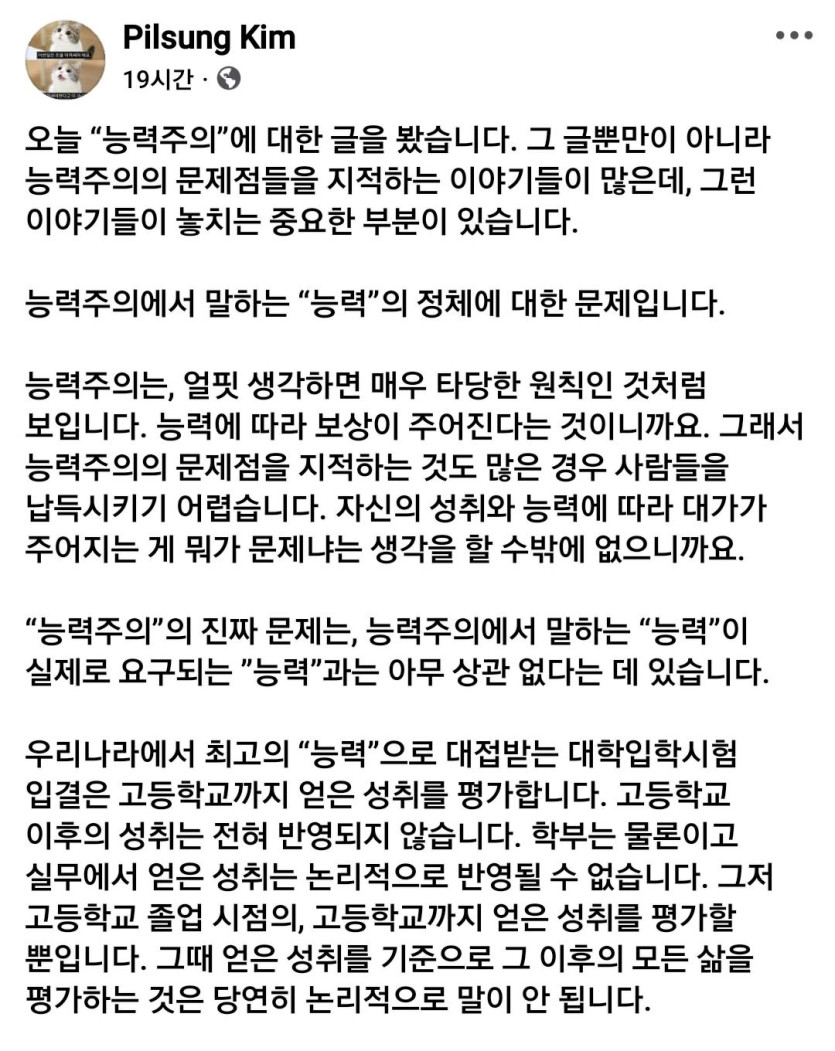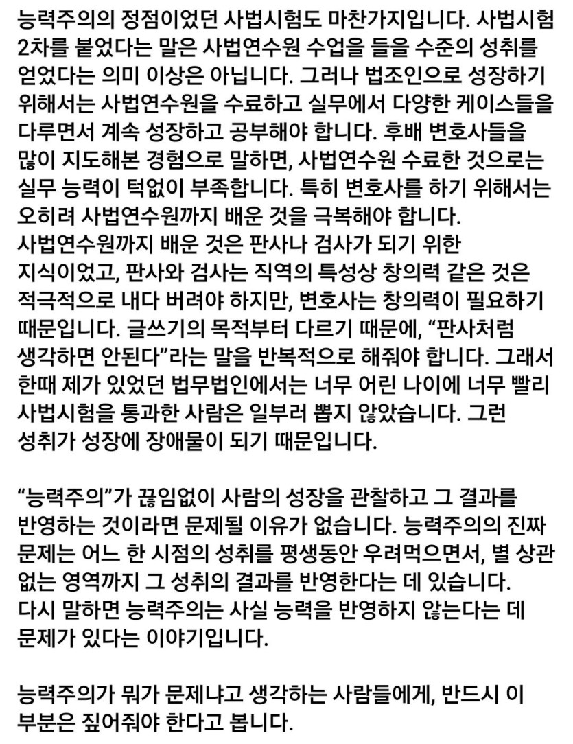 능력주의의 한계 택권보이 0 1101 0 0 07.26 04:00 주소복사 복사되었습니다! (이재명 대통령 재판 변호인인 김필성 변호사의 글 https://www.facebook.com/share/1FsmjgLNVX/ 0 0