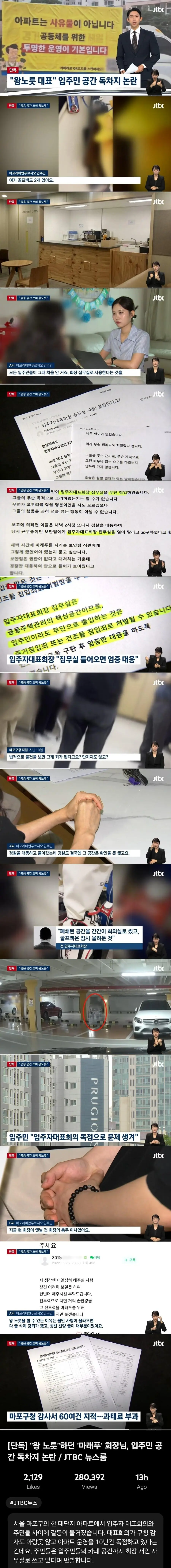 회장단은 JTBC의 추가 취재 요청에 답하지 않았고 관리사무소 측은 입주자대표회의가 구청의 과태료 처분에 불복해 재판을 진행 중이라고 밝혔습니다.