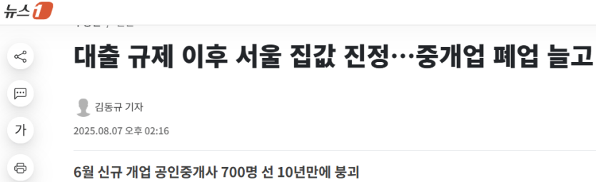 '25년 6월 개업 공인중개사, "10년 만에 700명이 안돼". 중개사 폐... 건방진놈 0 1009 0 0 08.08 02:00 주소복사 복사되었습니다! 서울 아파트 거래건수 75% 급감… "공인중개사" 수도 감소세 지속 6월 기준 개업 중개사 수는 전년 동월(11만 3,676명)보다 -2,725명(–2.4%) 줄었다. 0 0