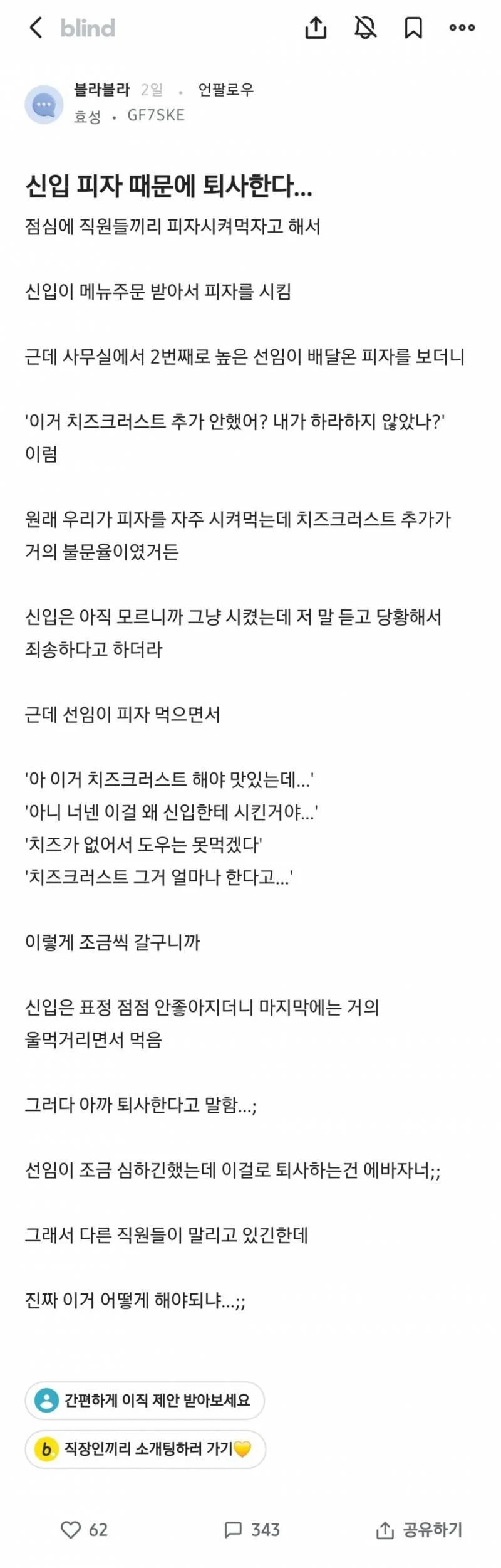 피자 때문에 퇴사하는 신입