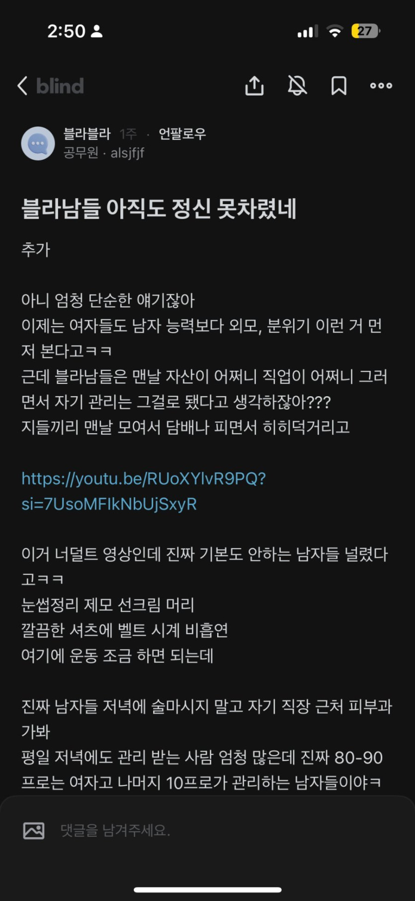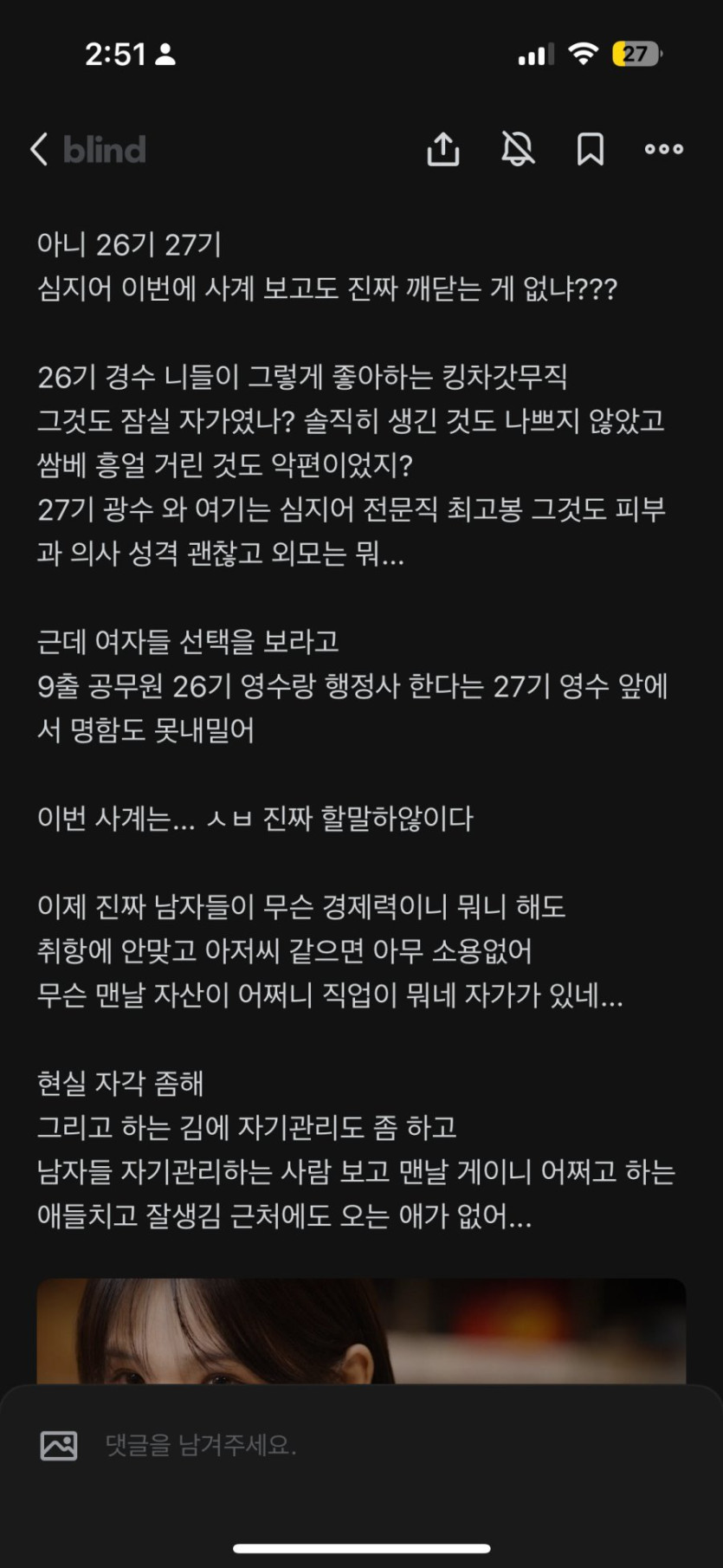 남자들 펙폭하는 블라인드 가을이꼬묘 0 1005 0 0 08.15 18:22 주소복사 복사되었습니다! 어느정도 공감가는게 예전에는 외모 커트라인 넘으면 본선은 직업재산 이런트렌드 였는데 지금은 직업재산은 커트라인만 넘으면 본선은 외모 이렇게되가고 있는게 느껴지더라 최근 참여하기 시작한 모임에서 평범? 평범아래 정도 생긴 의사랑 진짜 나솔 현실중계느낌 0 0