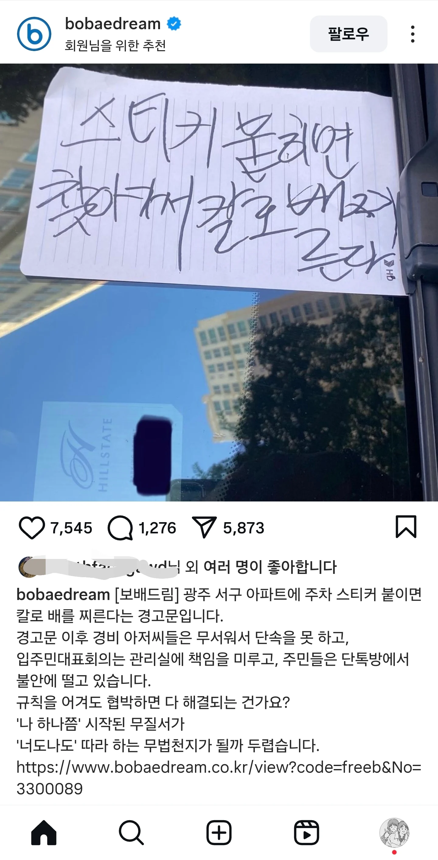 광주 서구 아파트에 주차 스티커 붙이면 찾아가서 배찌른다 경고문