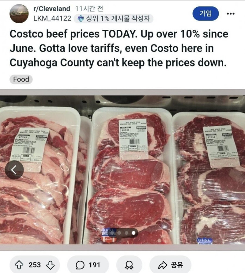 미국 물가 고멘나사이 0 1002 0 0 08.16 23:00 주소복사 복사되었습니다! 관세 이후 고기 가격 50%이상 폭등 브라질 관세로 이후 더 폭등할 가능성 농후..... 0 0