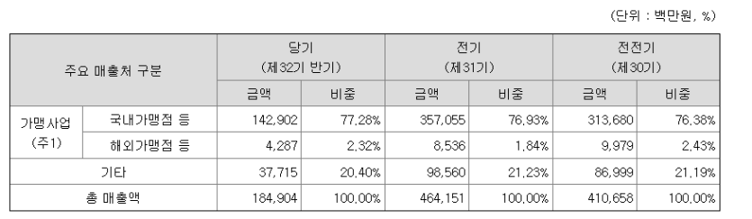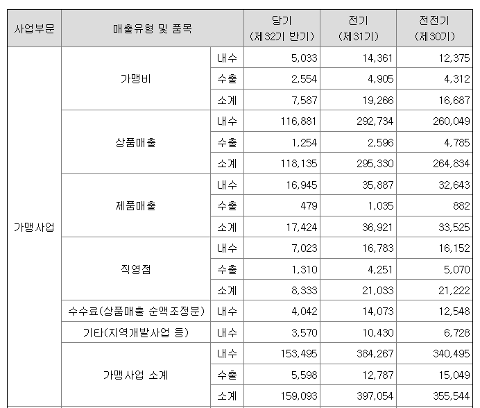 상품매출/제품매출 - 가맹점에 소스나 식자재 공급하고 받는 금액 이게 사실 메인인데 반기임을 고려도 꼬라박이 보인다