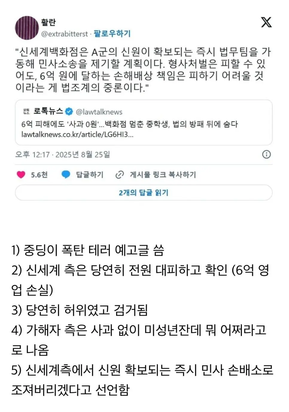 신세계, 폭탄테러 예고한 중학생한테 민사소송 걸 예정