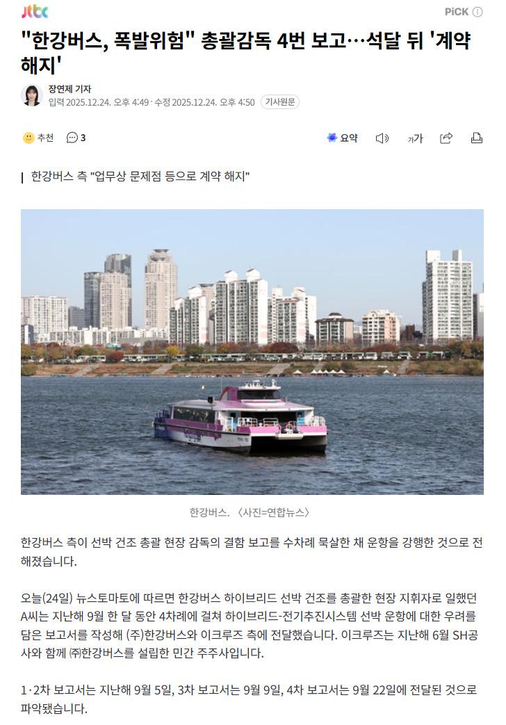 한강버스, 폭발위험 총괄감독 4번 보고..석달 뒤 계약해지 진격의포터 0 125 0 0 12.24 19:30 주소복사 복사되었습니다! 배 만들때 현장 감독이 결함이 있다고 4차례 보고했는데 위험하다는거 알려줬다고 짤림 그리하야 1,500억 짜리 움직이는 폭탄을 만들어냄 0 0