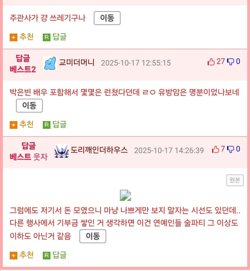디스패치가 깐 W코리아 유방암 자선행사 시스템 욕망창고 0 132 0 0 10.17 18:21 주소복사 복사되었습니다! 1. 명품 브랜드가 돈과 옷을 제공 (브랜드당 500~3000만원 정도 낸다고함) 2. W코리아는 연예인들 불러다 의상 지정해서 옷 입히고 포토월에 세워서 광고시켜줌 3. 스타킹 하나라도 제대로 착용 못하면 포토월에도 안세움 (배우 박보영 이라고함) 4. 입장 후엔 스텝 동반 불가, 유방암 관련 질문은 안하고 챌린지 시키고, 오늘 거울 몇번 봤어요? 애교 3종세트 이런거 물어봄 5. 사전 협의 없는 질문들에 소속사 관계자들도 난감 0 0
