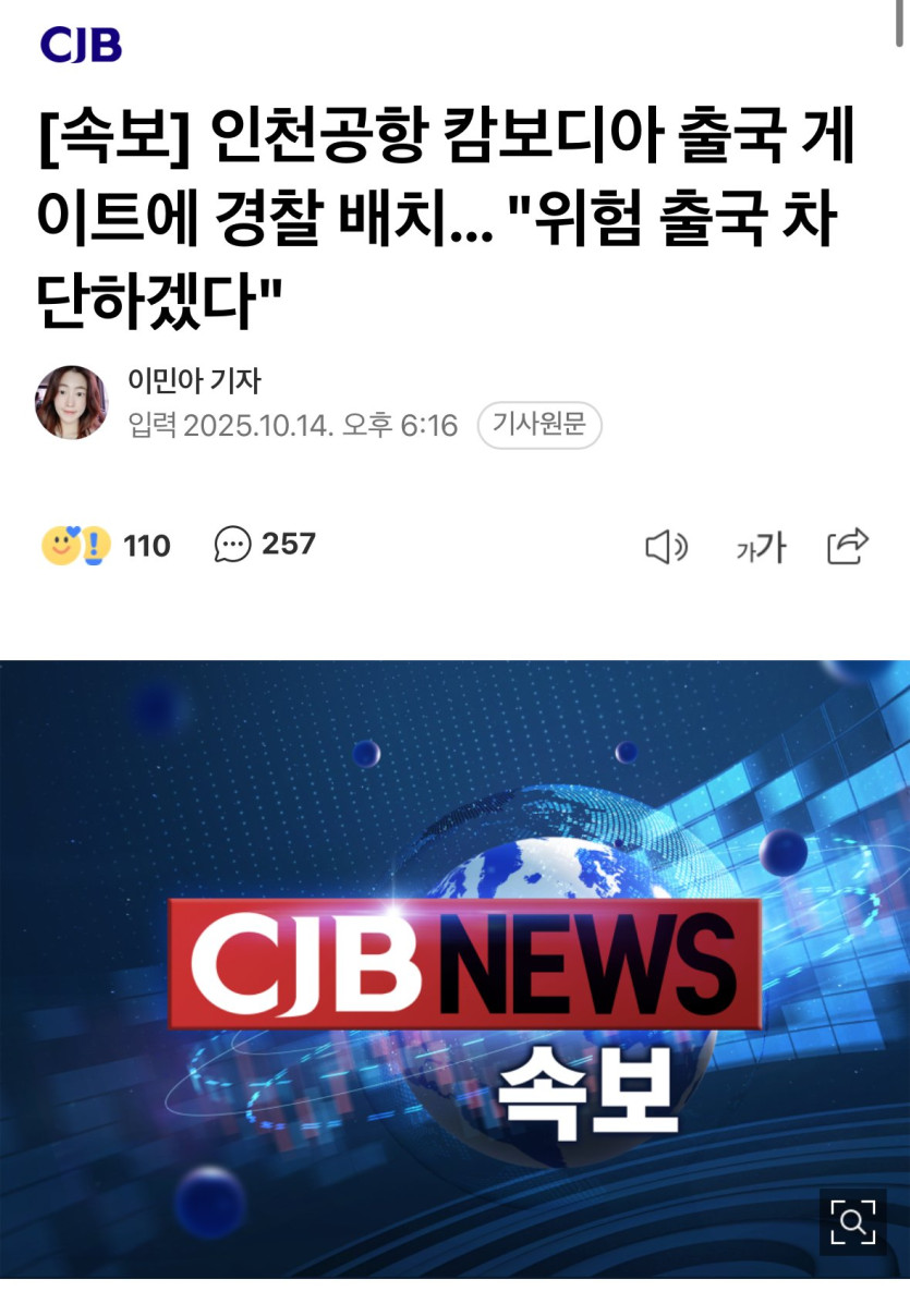 [속보] 인천공항 캄보디아 출국 게이트에 경찰 배치... "위험 출국... 모모아이 0 6 0 0 10.14 21:00 주소복사 복사되었습니다! https://n.news.naver.com/article/655/0000027853?type=breakingnews&cds=news_my_20s 0 0