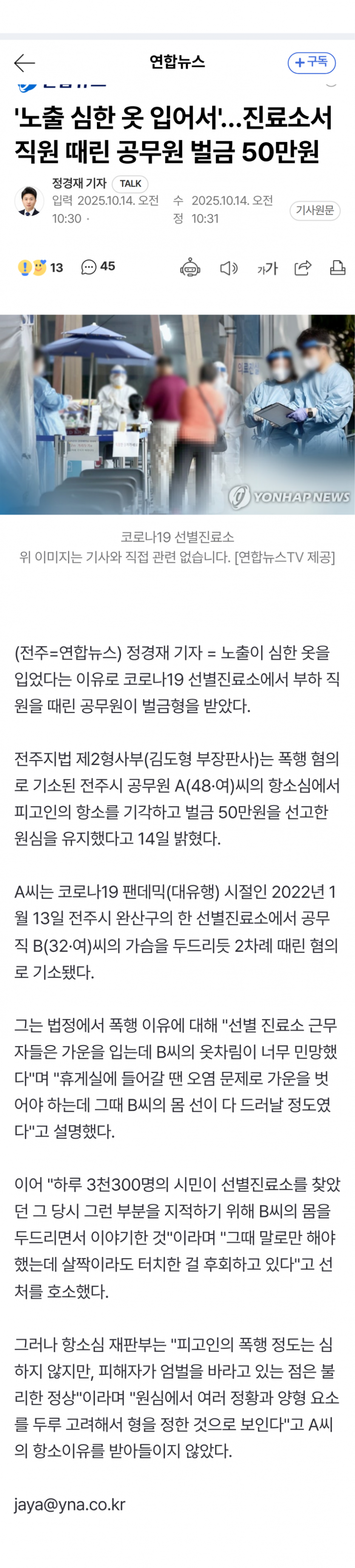 '노출 심한 옷 입어서'…진료소서 직원 때린 공무원 벌금 50만원