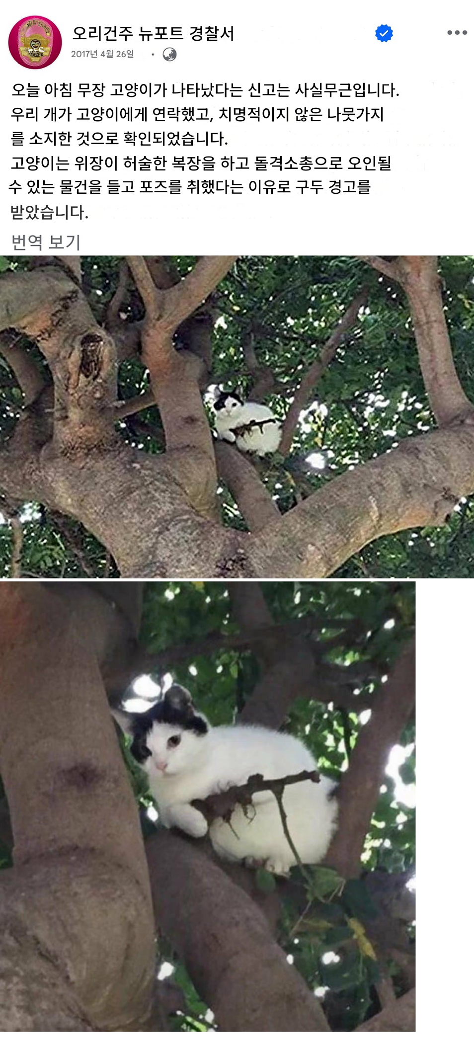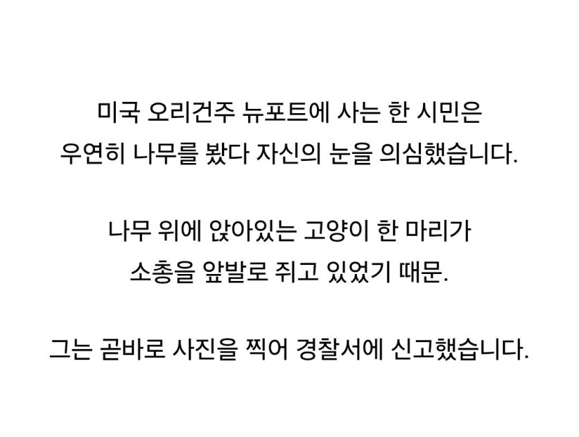 “나무 위에 소총 든 고양이가 있어요” 신고