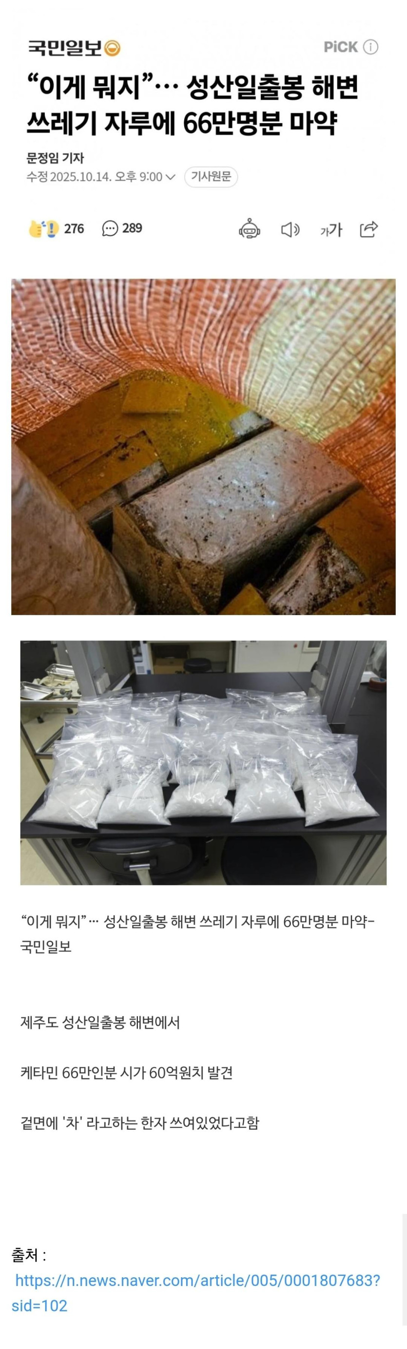 제주 성산일출봉 해변에서 마약 66만명분 발견