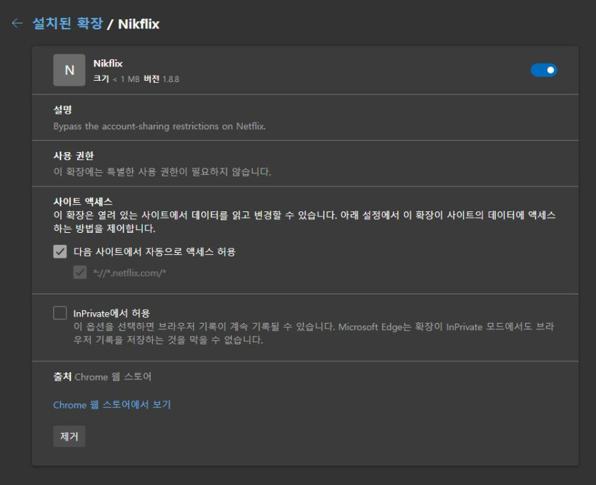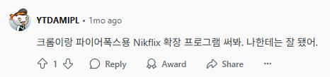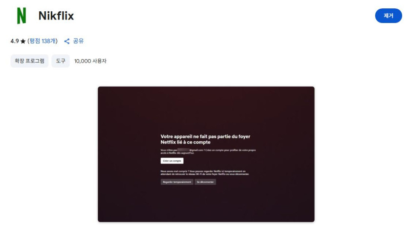 "넷플릭스 이용 가구에 포함되어 있지 않습니다." PC 해결 꿀팁 나라짱 0 7 0 0 2시간전 주소복사 복사되었습니다! Nikflix 확장프로그램을 설치하면 "회원님의 디바이스는 이 계정의 넷플릭스 이용 가구에 포함되어 있지 않습니다."라는 메세지 창이 떴다가 바로 사라집니다. 0 0