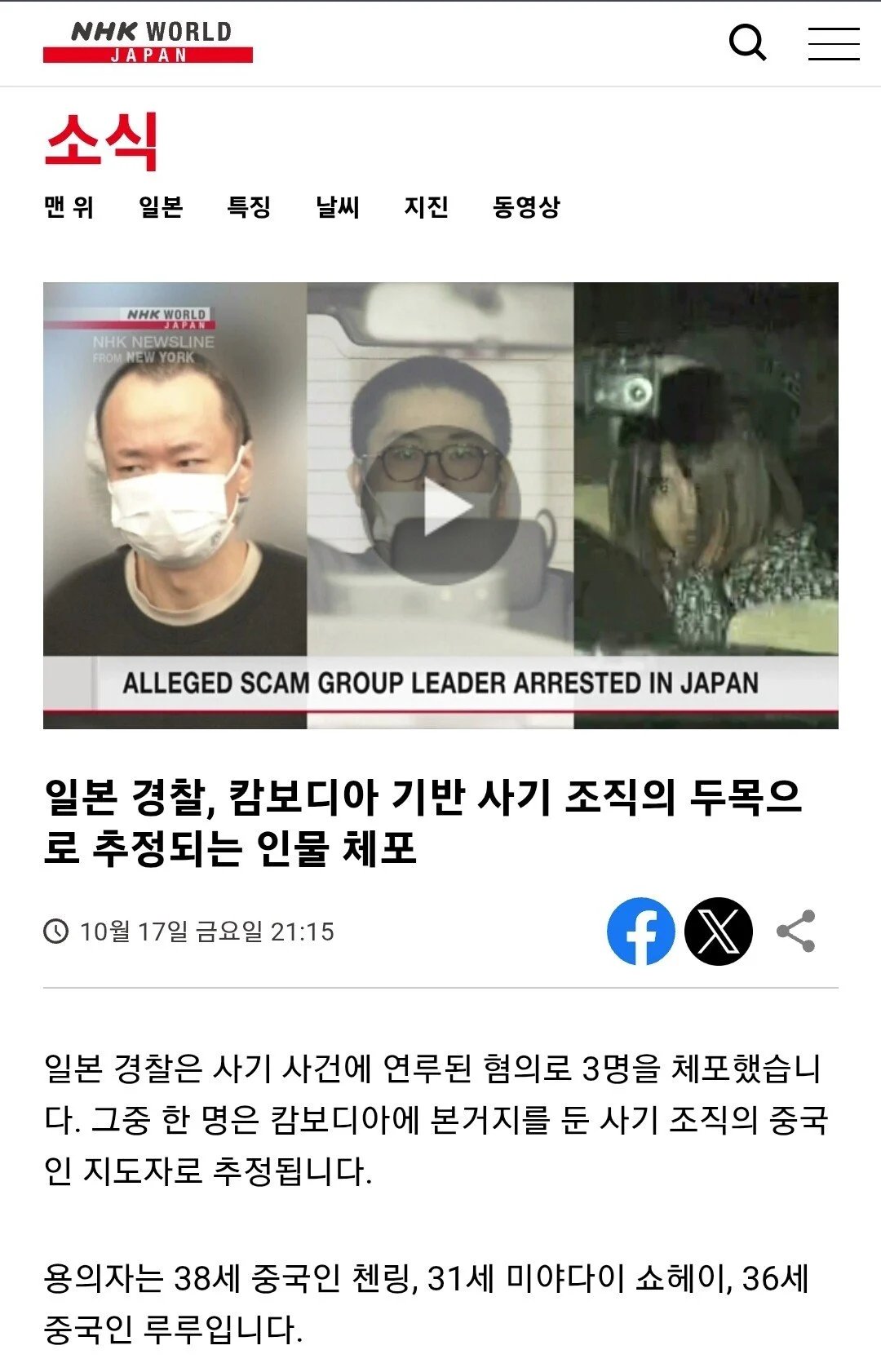 캄보디아 조직 간부 포함 3명 일본에서 검거 손만잡고할께 0 5 0 0 10.20 22:42 주소복사 복사되었습니다! https://www3.nhk.or.jp/nhkworld/en/news/20251017_18/ 0 0