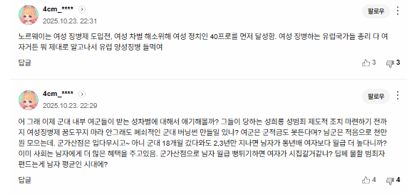군대는 국가와 국민을 지키기 위해 가는거지 뭔 여성할당제 해줘야 군대간대. 의무를 지기 싫으니 싫으니 별 핑계 다 대는거지. 성폭력이 걱정되고 여성을 위계질서랑 체칠이 안맞다면 육해공 사관학교, 부사관 여자들 입학.입대 못하게 막아야지. 군가산점 없어진지 16년이 지났는데 아직도 군가산점이 있다고 소리지르는건 뭐냐?