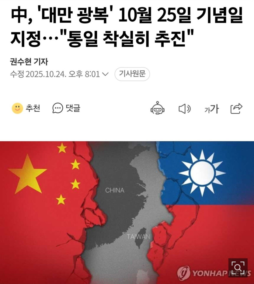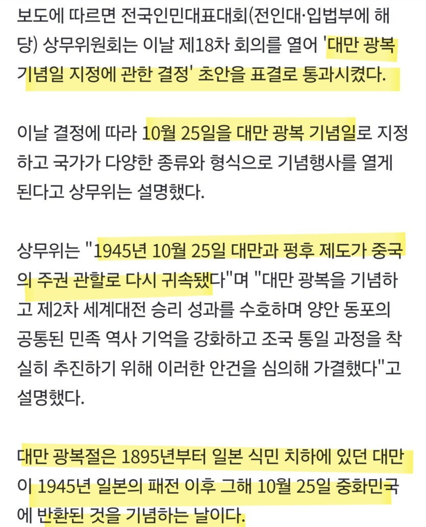 중국, 10월 25일을 일제로부터 대만의 광복절로 지정..대만은 반발
