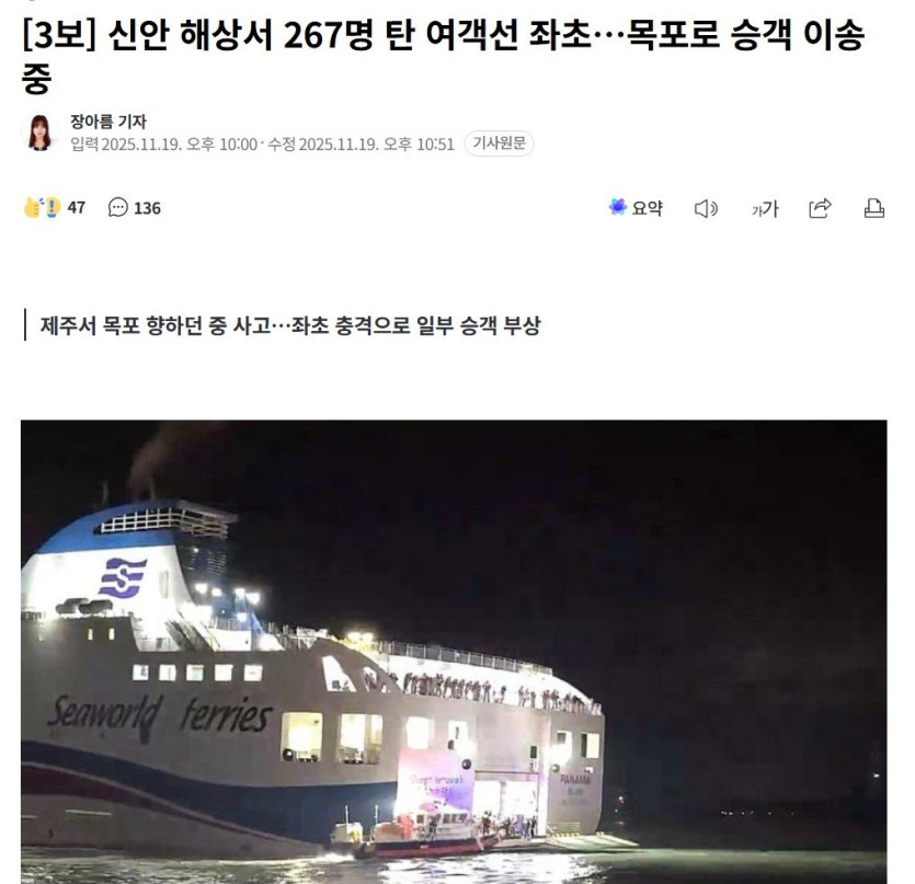 [3보] 신안 해상서 267명 탄 여객선 좌초…목포로 승객 이송 중 돼람쥐 0 13 0 0 7시간전 주소복사 복사되었습니다! 일부 승객 부상(5명) 빼곤 다행히 침몰등은 없는듯 아직까진 침수피해도 없다니 다행 날 추워져서 침몰위험 있으면 큰일났을텐데 0 0