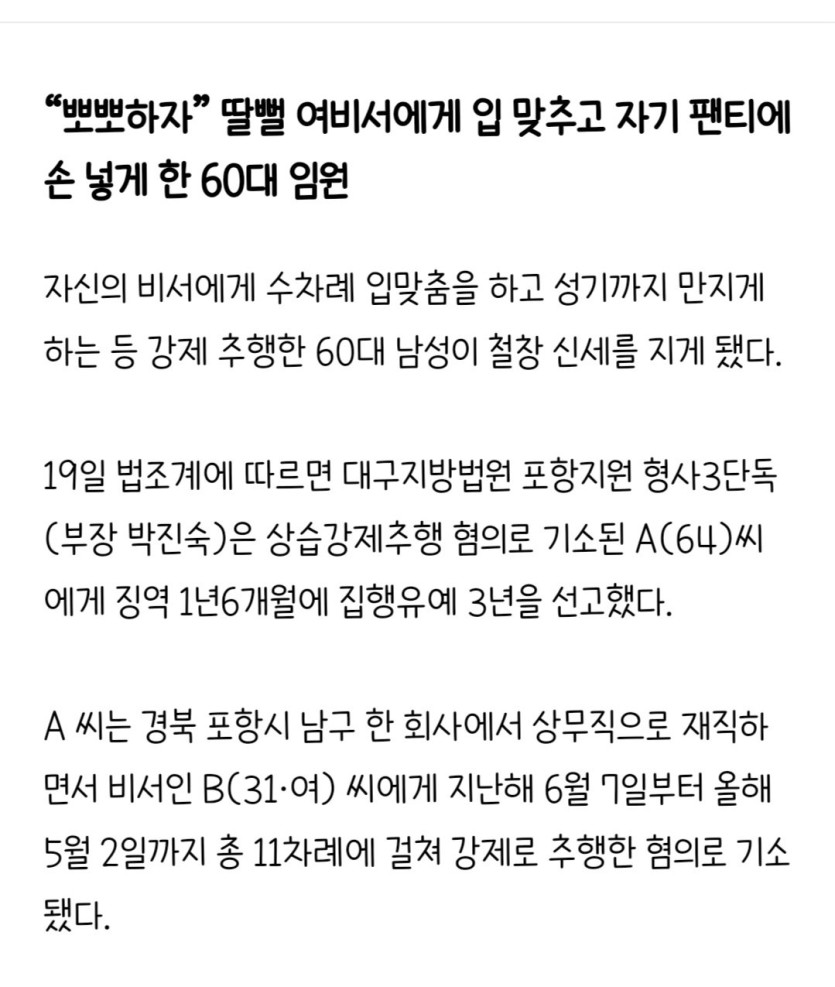 "뽀뽀하자" 딸뻘 여비서에게 입맞추고 자기팬티에 손넣게한 60대 임원