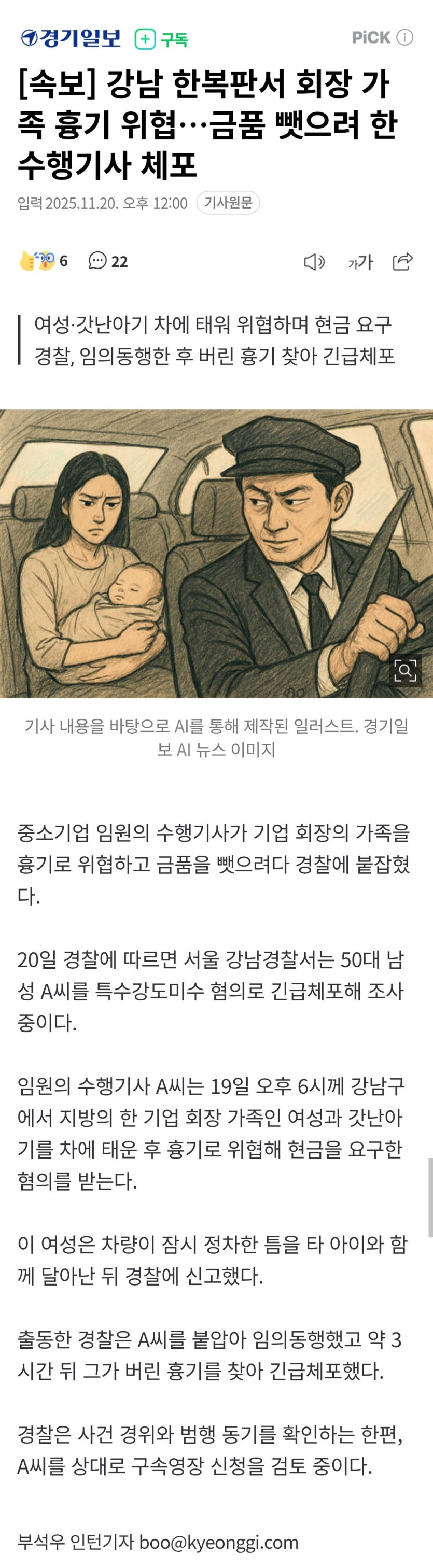 [속보] 강남 한복판서 회장 가족 흉기 위협…금품 뺏으려 한 수행기...