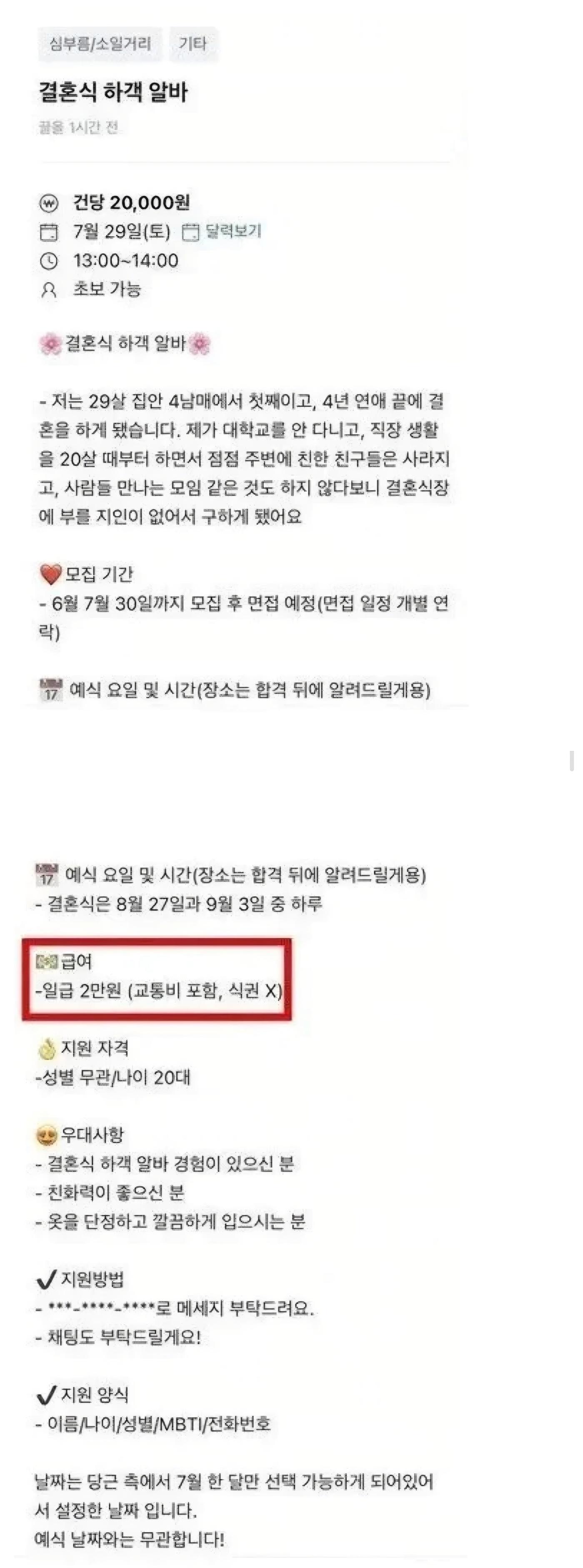친구가 없는 이유? 그라비우스 0 7 0 0 3시간전 주소복사 복사되었습니다! 면접까지ㅋ 급여는 그렇다 치더라도 회사에서 일을 시켜도 밥은 먹이지 않나? 하객 알바가 있긴 있군요. 0 0
