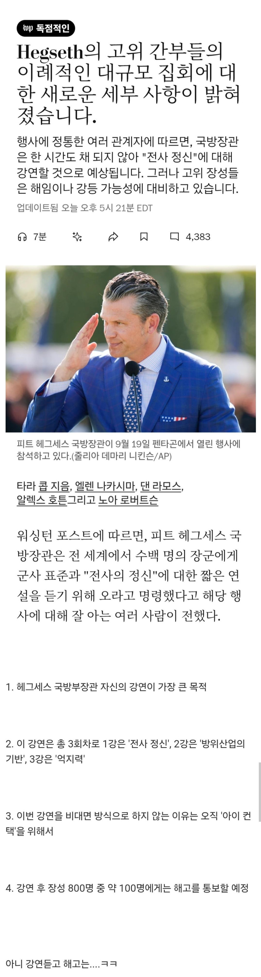 긴급소집 장성 800명 중 100명은 해고예정 쇄혼 0 77 0 0 09.28 00:00 주소복사 복사되었습니다! https://www.washingtonpost.com/national-security/2025/09/26/hegseth-generals-meeting-warrior-speech/ 0 0