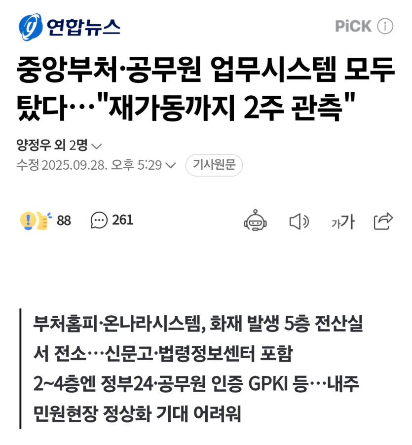 중앙부처·공무원 업무시스템 모두 탔다…"재가동까지 2주 관측" 나는아니겠지 0 69 0 0 09.28 21:22 주소복사 복사되었습니다! https://n.news.naver.com/article/001/0015654214?type=breakingnews&cds=news_edit 0 0