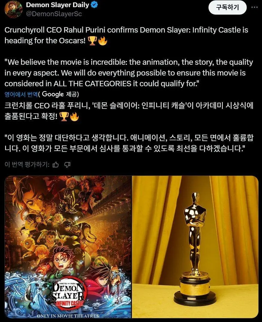 영화) [귀멸의칼날 무한성편] 아카데미 애니메이션상 출품 쥬거라앗 0 56 0 0 09.29 11:22 주소복사 복사되었습니다! 출품은 했지만 노미네이트, 수상까지 이어질지는 모른다 출품 및 캠페인은 트랜스포머나 마블영화도 곧잘 했던거라 0 0