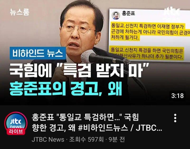 홍준표, 통일교 특검 받으면 국힘 다 죽는다. 받지마라!