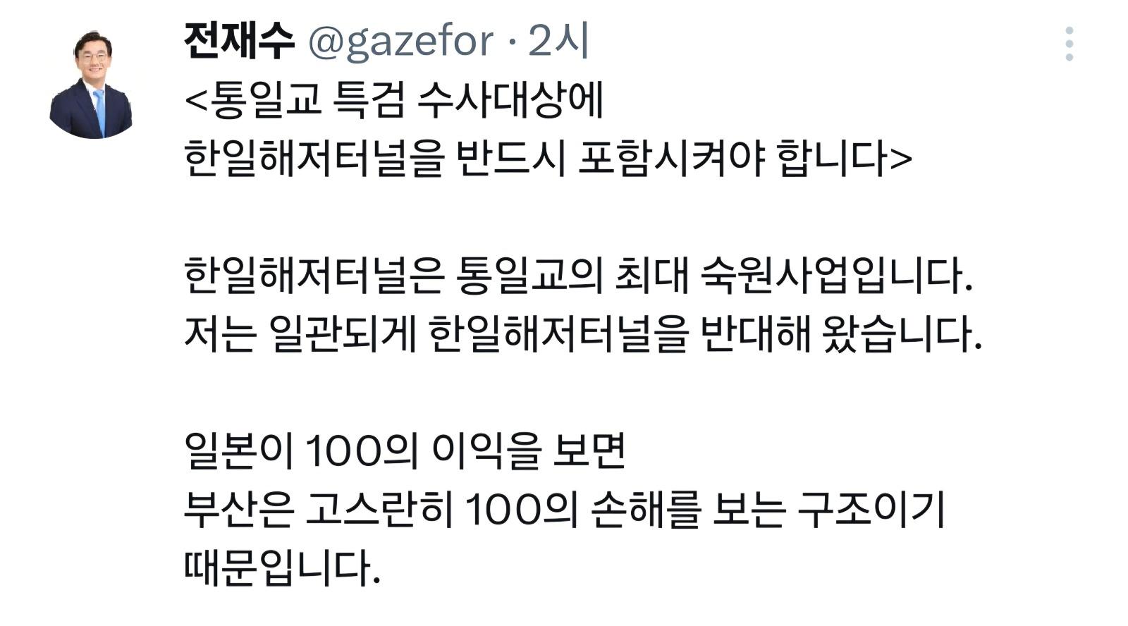 전재수 의원 "통일교 특검 대상에 한일해저터널도 포함시켜야"