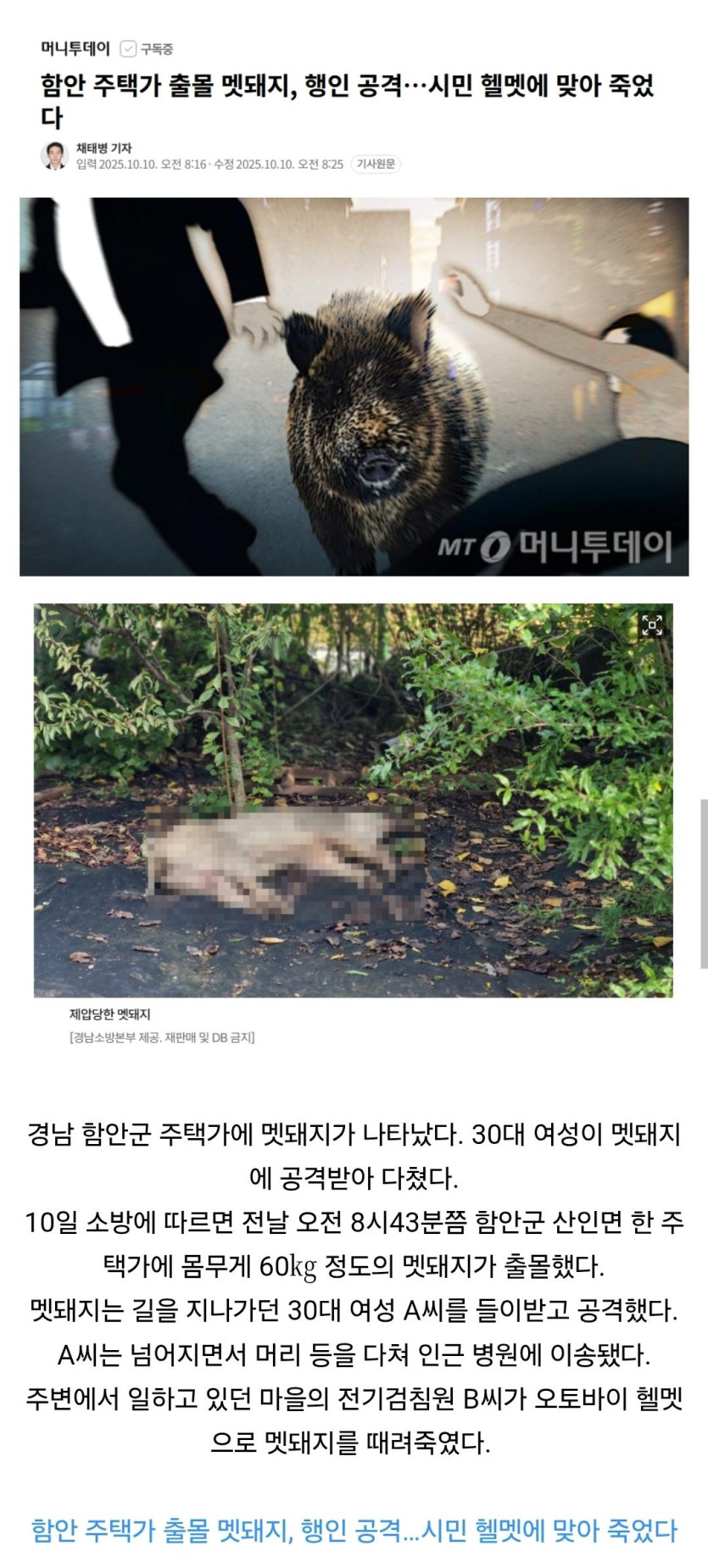 멧돼지...시민 헬멧에 맞아 죽었다