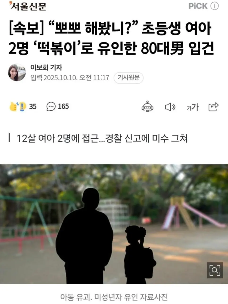 “뽀뽀 해봤니?” 초등생 여아 2명 ‘떡볶이’로 유인한 80대男 입건