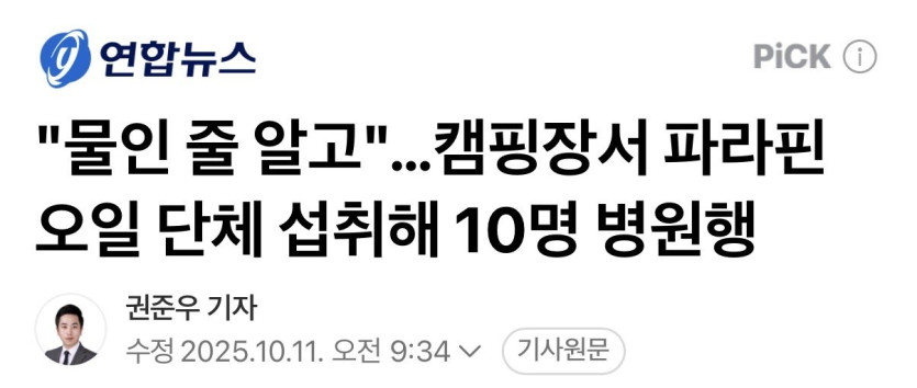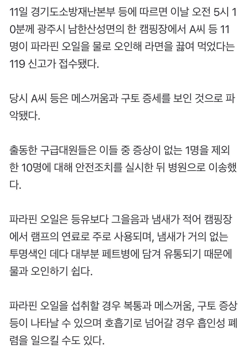 "물인 줄 알고"…캠핑장서 파라핀 오일 단체 섭취해 10명 병원행 김뱁새 0 12 0 0 4시간전 주소복사 복사되었습니다! https://naver.me/GMPc4Cod https://naver.me/GMPc4Cod 0 0