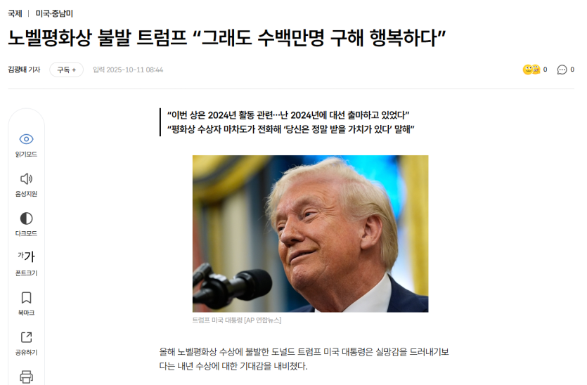 노벨평화상 불발 트럼프 “그래도 수백만명 구해 행복하다”