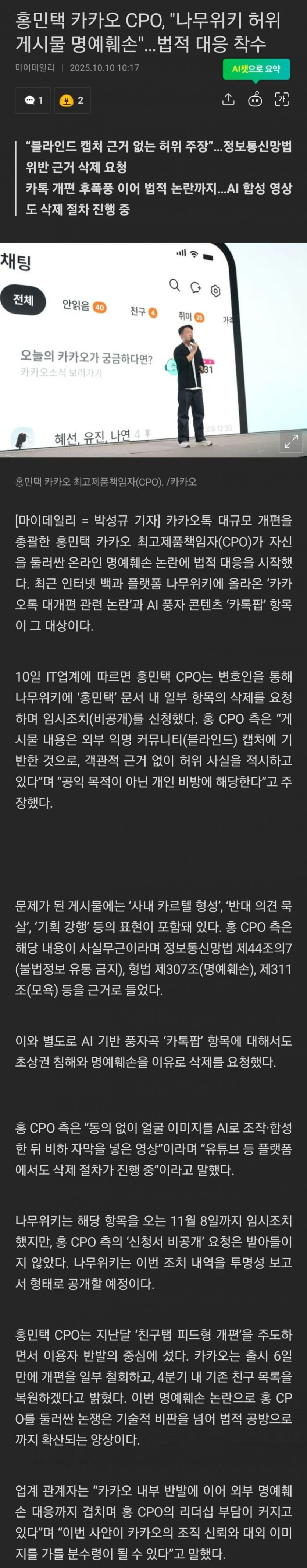카카오 홍민택 CPO "명예훼손 법적조치할것"