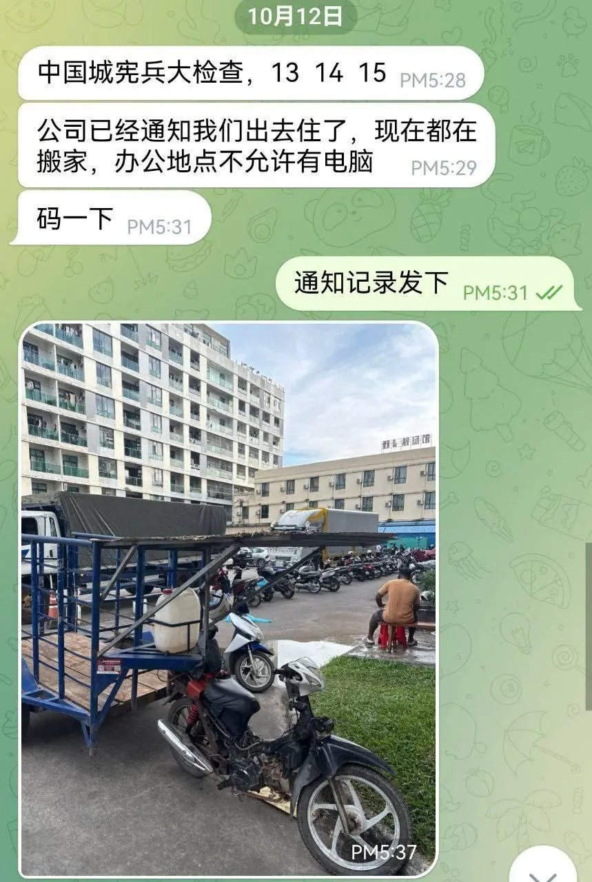 (캄보디아)작전 계획 유출되서 범죄자들 방빼는중 퐁퐁퐁 0 15 0 0 2시간전 주소복사 복사되었습니다! 대화 번역 10월 12일 -중국성(中國城)에서 대규모 단속이 있을 예정이야, 13일·14일·15일. -회사에서 이미 우리에게 밖으로 나가서 숙소를 옮기라고 통보했어. 지금 다들 이사 중이야. -사무실에는 컴퓨터를 두는 게 허용되지 않아. -사진 좀 찍어줘. 0 0