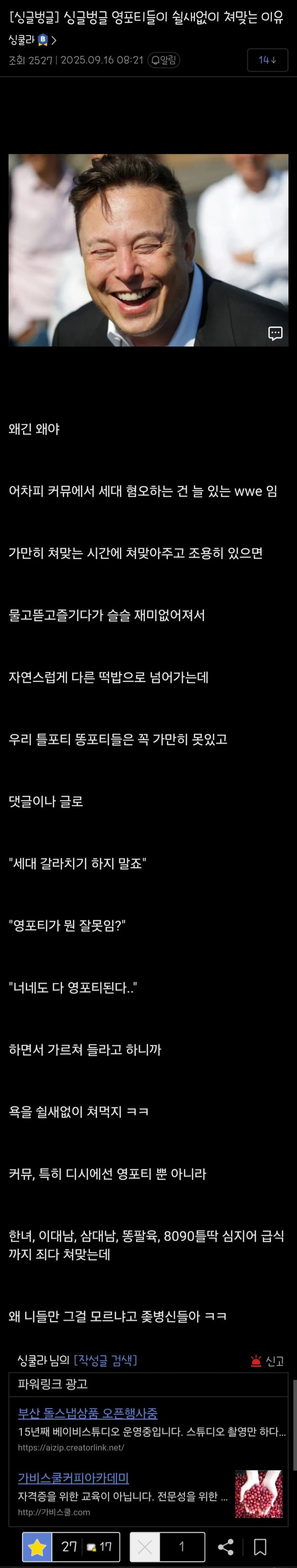 싱글벙글 포티햄들이 쉴새없이 뚜드려 맞는 이유.jpg 여의도피멍 0 5 0 0 2시간전 주소복사 복사되었습니다! 조카들이랑 놀아주는거마냥 WWE를 진짜 존나 맛있게 받아줌 ㅋㅋㅋㅋㅋ 진짜 타격감 GOAT 개인적으로는 커뮤에서 볼 법한 그런 부류들이 주변에 없어서 그냥 커뮤 농담따먹기 정도로 생각함ㅋㅋㅋ 0 0