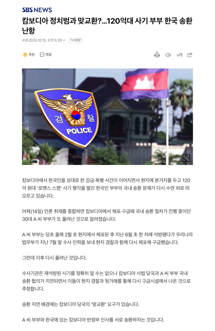 캄보디아 정치범과 맞교환?…120억대 사기 부부 한국 송환 난항