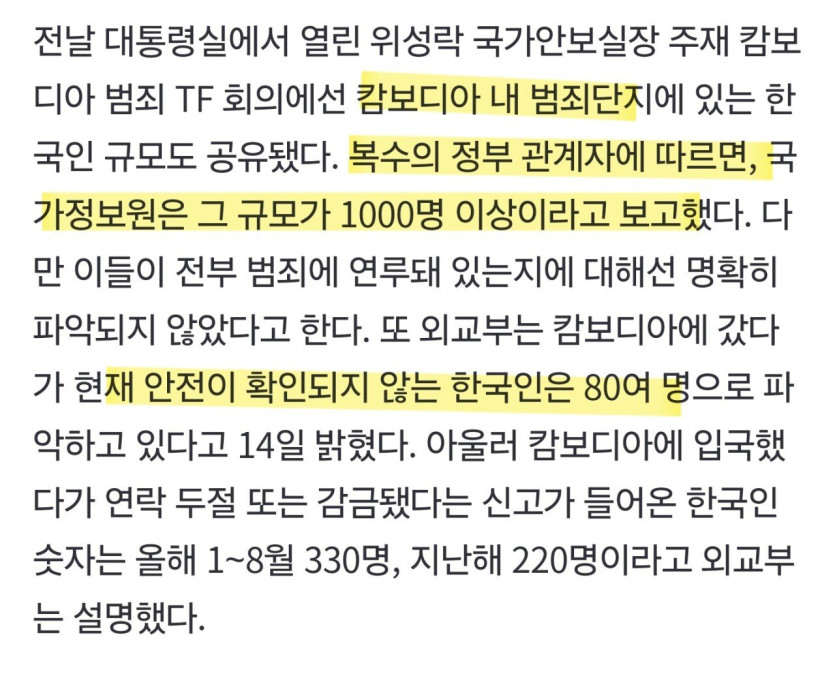 국정원 "캄보디아 범죄단지내 한국인 1천명 이상"