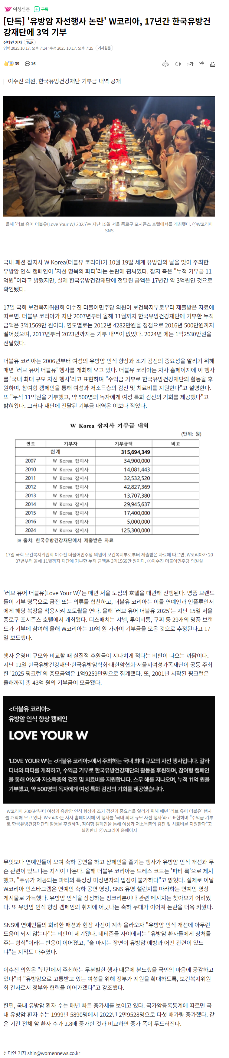 [단독] '유방암 자선행사 논란' W코리아, 17년간 한국유방건강재단...